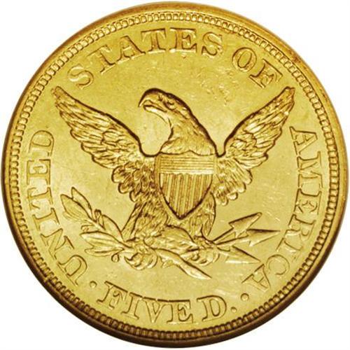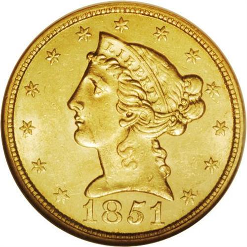 <B>1851<$5> MS61 NGC.</B></I> A better date that is more difficult than its large mintage would indicate. Some detail is lacking from several of the stars and on the eagle's neck. The mint luster is a bit thin in the fields, but fully present with no questions about the Uncirculated status of the coin. Surprisingly few abrasions are noted with the only mentionable one being a mark under the eagle's left (facing) wing. Census: 24 in 61, 29 finer (4/06).