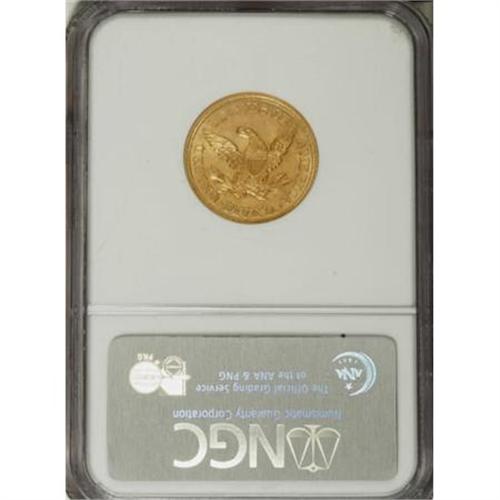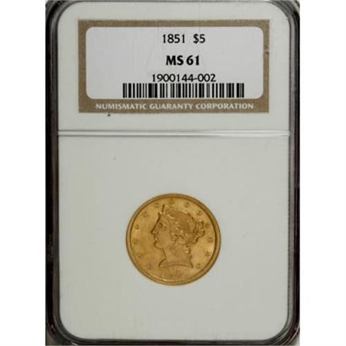 <B>1851 $5 MS61 NGC.</B></I> A full strike and frosty yellow luster are accented by light pink toning. Although the mintage of 377,505 coins was substantial for half eagles in the middle 19th century, nearly all survivors grade just XF or AU. Jeff Garrett and Ron Guth provide population data for every gold issue in their <I>Gold Encyclopedia,</B></I> summarizing the total population of NGC, PCGS, and ANACS certified pieces. For 1851, a total of 441 coins were certified with an average grade of 53.8. Understanding that higher grade coins are more likely to be certified, this data is quite revealing. Census: 26 in 61, 30 finer (7/07).<BR><BR><B>Coin Engraver:</B> Christian Gobrecht<BR><BR><b>Shipping:</b> Coins & Currency (<a target="_blank" href="http://www.heritageauctions.com/common/shipping.php">view shipping information</a>\)