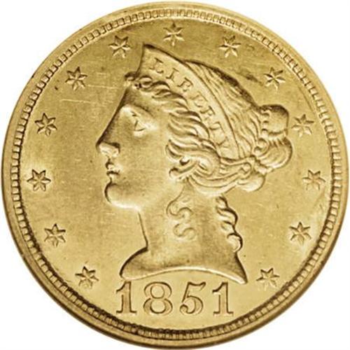 <B>1851 $5 MS61 NGC.</B></I> The 1851 half eagle is notable for its surprising lack of availability in Mint State grades, yet it remains comparatively underpriced in light of its conditionally scarce status. This unworn representative offers sharp detail and pleasing luster, with few marks evident on the yellow-orange surfaces. A few faint marks appear near the characteristically large date. Census: 26 in 61, 30 finer (7/07).<BR><BR><B>Coin Engraver:</B> Christian Gobrecht<BR><BR><b>Shipping:</b> Coins & Currency (<a target="_blank" href="http://www.heritageauctions.com/common/shipping.php">view shipping information</a>\)