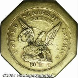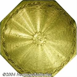 <B>1851<$50 LE> Humbert Fifty Dollar, 887 Thous. 50 Rev. Genuine (XF Details), Tooled, NCS.</B></I> K-4, High R.5. Charles Cushing Wright's defiant eagle forms the focal point of the obverse and an incuse 50 is seen in the center of the reverse. Although encapsulation blocks it from view, the rim bears the rare blundered incuse inscription AUGUSTUS/ HUMBERT/ UNITED/ STATES/ ASSAYER (inverted)/ OF GOLD/ CALIFORNIA/ 1851. This massive San Francisco provisional mint gold "slug" exhibits light green-gold color and relatively minor surface marks for such a massive territorial issue. Both the fineness and the denomination appear to be strengthened by tooling. Listed on page 289 of the 2004 <I>Guide Book.</B></I> <BR><BR><B>Important notice:</B> Heritage usually auctions material at the rate of 200-250 lots per hour. On some occasions eBay Live bid software or the Internet may not be able to keep up with the pace of the auction. We recommend placing a realistic absentee bid now as insurance to avoid disappointment. Occasionally the auctioneer may eliminate or reject an eBay Live bid, and the auctioneer may also reopen a lot after the close of the eBay live bidding (usually because we missed an audience bid), and may reject your bid even if it shows you as the winning bidder. By bidding via eBay Live, you agree that Heritage may award the lot to another bidder at its sole discretion under the circumstances described above or any other reasonable circumstances. Since eBay bids are not shown to us until we open the lot on the floor, we treat those bids just like floor bids. In most cases the floor responds before the eBay bid is presented to us, due to Internet lag time, so for consistency we have made it a policy that floor bids are always considered first over tie eBay live bids. Also please note that all Heritage lots purchased through eBay Live carry a 20% Buyer's Premium. Please make sure you read the Terms and Conditions before you bid. </span></font></tr></table></td></tr></table>