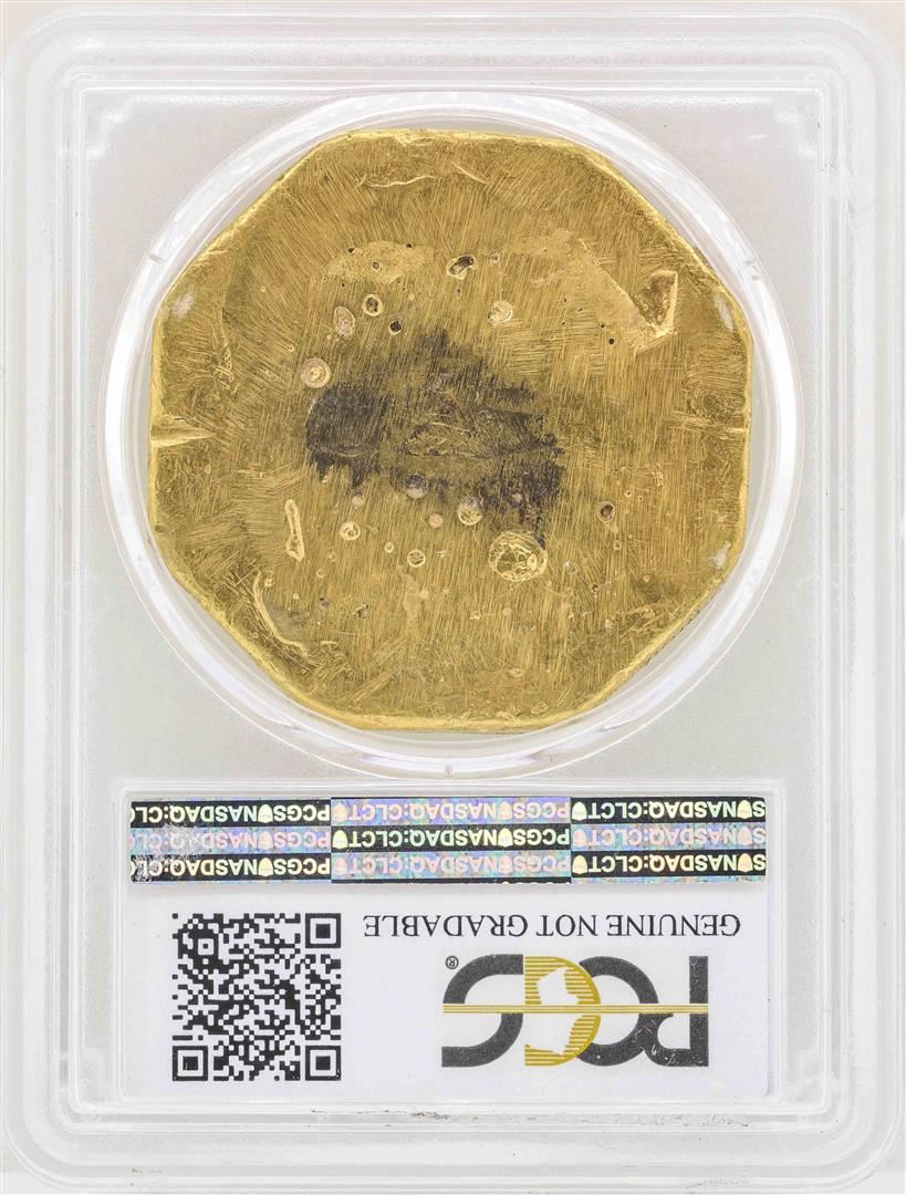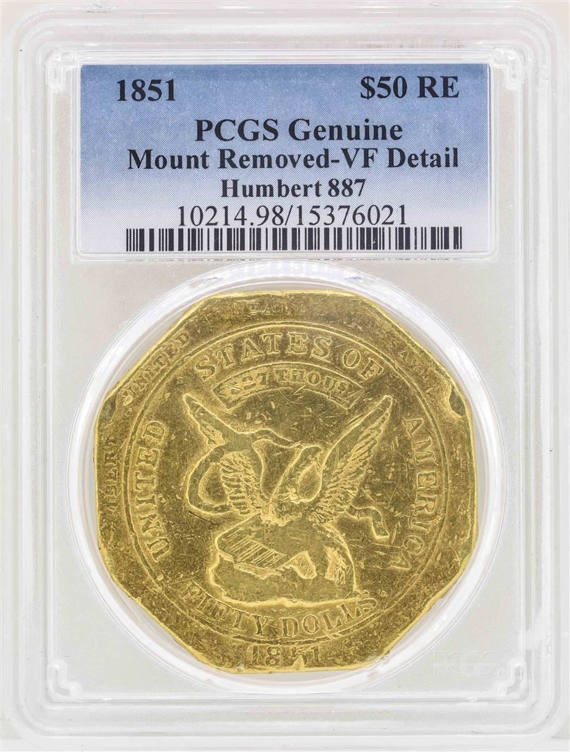 One 1851 $50 RE Humbert Reeded Edge Gold Slug Coin PCGS VF Details. The $50 gold pieces, issued by the United States Assay Office of Gold in San Francisco, when originally designed were often referred to as "ingots" opposed to coins, today they are referred to as "slugs". The $50 Slugs are one of the most popular of all California Gold pieces today primarily due to their unusual octagon shape and their $50 denomination. Due to their high gold content & weight many of them were melted down over the years however now their numismatic value has far exceeded any melting value and they are a very desirable piece amongst collectors and enthusiast alike. This is a great example of an affordable yet still desirable piece for the collector not looking to spend six figures for the higher grade uncirculated pieces. PCGS Graded.