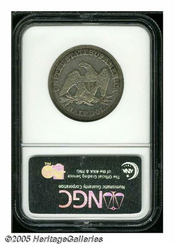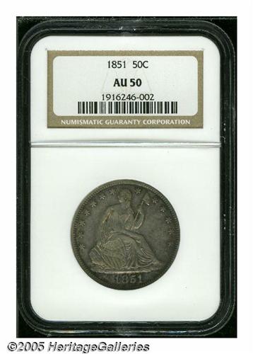 <B>1851<50C> AU50 NGC.</B></I> WB-101. Normal Date. Mechanical doubling or "shelf" doubling is seen on the date. Well struck, except on several of the obverse stars, the surfaces are primarily gray in color, but reddish patina with a dab of cobalt-blue appears at the peripheries, on each side. A high end coin for the grade, barely worn with a mere handful of minor abrasions on the upper reverse. A scarce issue at most grade levels.