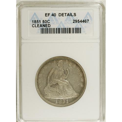 <B>1851 50C --Cleaned--ANACS. XF40 Details.</B></I> Deep navy-blue and golden-brown consume the reverse, while the obverse is only lightly toned. A mildly cleaned piece with lustrous devices and unblemished fields. The rising value of silver led to the rarity of this old tenor date.<BR><I>From The Hoosier Discovery Collection.</B></I><BR><BR><b>Shipping:</b> Coins & Currency (<a target="_blank" href="http://www.heritageauctions.com/common/shipping.php">view shipping information</a>)