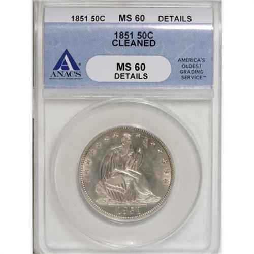 <B>1851 50C --Cleaned--ANACS. MS60 Details.</B></I> Sharply struck with no trace of wear, an unusual state for this earlier Seated half issue. The silver-gray surfaces are hairlined with suspiciously uniform luster after a past cleaning.<BR><I>Ex: ANA Centennial Auction, (Bowers and Merena, 8/91), lot 398.<BR>From The John Stimson, Sr. Collection, Part One.</B></I><BR><BR><B>Coin Engraver:</B> Christian Gobrecht<BR><BR><b>Shipping:</b> Coins & Currency (<a target="_blank" href="http://www.heritageauctions.com/common/shipping.php">view shipping information</a>)