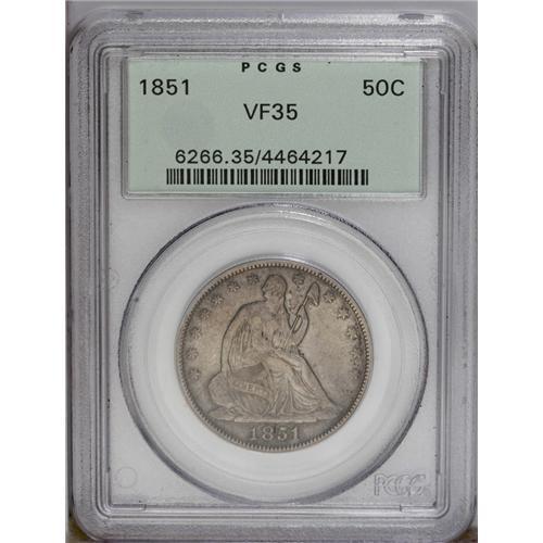 <B>1851<50C> VF35 PCGS.</B></I> WB-101. An evenly circulated slate-gray and tan Seated half. A better date, since silver coins did not circulate at its time of production. The reverse features an interesting square-shaped die defect on the lower right portion of the shield. Housed in a green label holder.<BR><I>From The Steve Glenn Collection.</B></I> <BR><BR><B>Important notice:</B> Heritage usually auctions material at the rate of 200-250 lots per hour. On some occasions eBay Live bid software or the Internet may not be able to keep up with the pace of the auction. We recommend placing a realistic absentee bid now as insurance to avoid disappointment. Occasionally the auctioneer may eliminate or reject an eBay Live bid, and the auctioneer may also reopen a lot after the close of the eBay live bidding (usually because we missed an audience bid), and may reject your bid even if it shows you as the winning bidder. By bidding via eBay Live, you agree that Heritage may award the lot to another bidder at its sole discretion under the circumstances described above or any other reasonable circumstances. Since eBay bids are not shown to us until we open the lot on the floor, we treat those bids just like floor bids. In most cases the floor responds before the eBay bid is presented to us, due to Internet lag time, so for consistency we have made it a policy that floor bids are always considered first over tie eBay live bids. Also please note that all Heritage lots purchased through eBay Live carry a 20% Buyer's Premium. Please make sure you read the Terms and Conditions before you bid. This lot is being auctioned in conjunction with a live floor auction by Heritage Galleries & Auctioneers. All final auction and invoice information will be supplied by Heritage Galleries & Auctioneers, and all other information should be considered preliminary. Lot:1988 <BR><BR><B>Winning Notification and Billing:</B> After the FINAL session in this auction is complete, Heritage will send e-mail and snail mail invoices. This process normally takes several days. All final auction and invoice information will be supplied by Heritage Galleries & Auctioneers, and all other information should be considered preliminary. <BR><BR>This auction will be conducted on a live auction floor and over the Internet through eBay Live. If you choose to place an absentee bid, please take a moment to <font color='#0000ff'><u><a href='http://pages.ebay.com/liveauctions/help/before/laabsentee.html'>learn how eBay Live absentee bidding works</a></u></font><font color='#000000'>