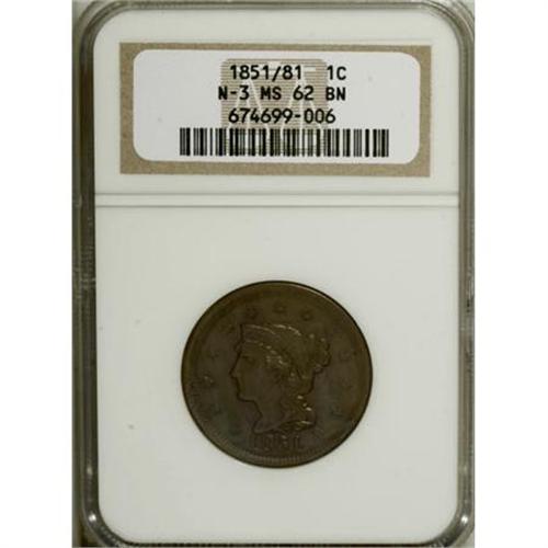 <B>1851/81 1C MS62 Brown NGC.</B></I> N-3. NGC Census: (6/34). PCGS Population (2/17). Mintage: 9,889,707. Numismedia Wsl. Price for NGC/PCGS coin in MS62: $575. (#1895)<BR><BR><B>Coin Engraver:</B> Christian Gobrecht<BR><BR><b>Shipping:</b> Coins & Currency (<a target="_blank" href="http://www.heritageauctions.com/common/shipping.php">view shipping information</a>)
