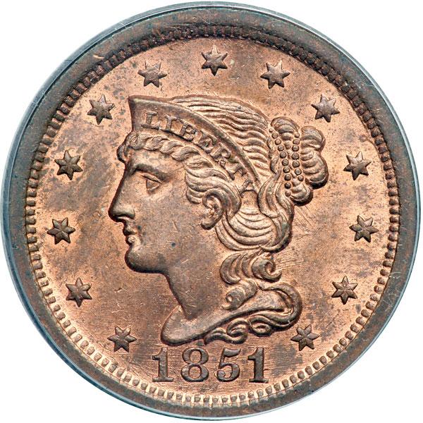 1851/81 N-3 R1 51 over Inverted 18 MS63. Bright original mint red toning to light steel brown on the highpoints, more than half the original color remaining. There are faint traces of an old fingerprint around star 4 and a few microscopic contact marks on the cheek. The best identifying mark is a tiny planchet chip on the rim above star 5, as struck. Sharp EDS, die state a. The repunched 51 over 81 is bold and the obverse fields are covered with diagonal die finishing lines. Removed from a PCGS slab graded MS64RB (PCGS label included). A choice example of this popular blundered date variety. DWH #2307.