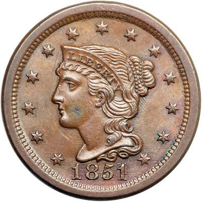 1851/81 N-3 R1. AU-55. Blundered Date 51 over Inverted 18, the so-called 51 over 81 variety. Lustrous light chocolate and steel brown with traces of faded mint red showing in protected areas on both sides. The only notable mark is a small, shallow planchet chip in the center of the cheek, and this area on the cheek is toned a slightly darker color. Otherwise this cent has mint state eye appeal. Sharply struck EDS, die state a. The obverse fields are covered with die finishing lines and the blundered date feature is bold.