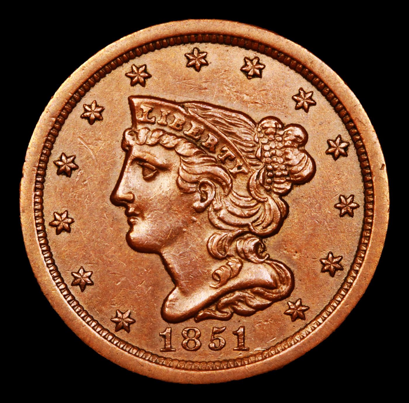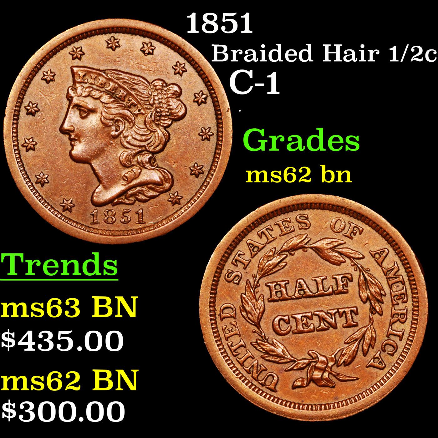 1851 Braided Hair Half Cent 1/2c Grades Select Unc BN. Per Ron Guth of PCGS : The Braided Hair half cents boast some of the lowest mintages of any U.S. coin types and are among the best values, as well. Every date in this type boasts a low mintage. By way of comparison, the mintage of the any Braided hair Half Cent is almost a fraction of the mintage of the 1909-S VDB Lincoln Cent (a far more valuable coin), making this an excellent value.