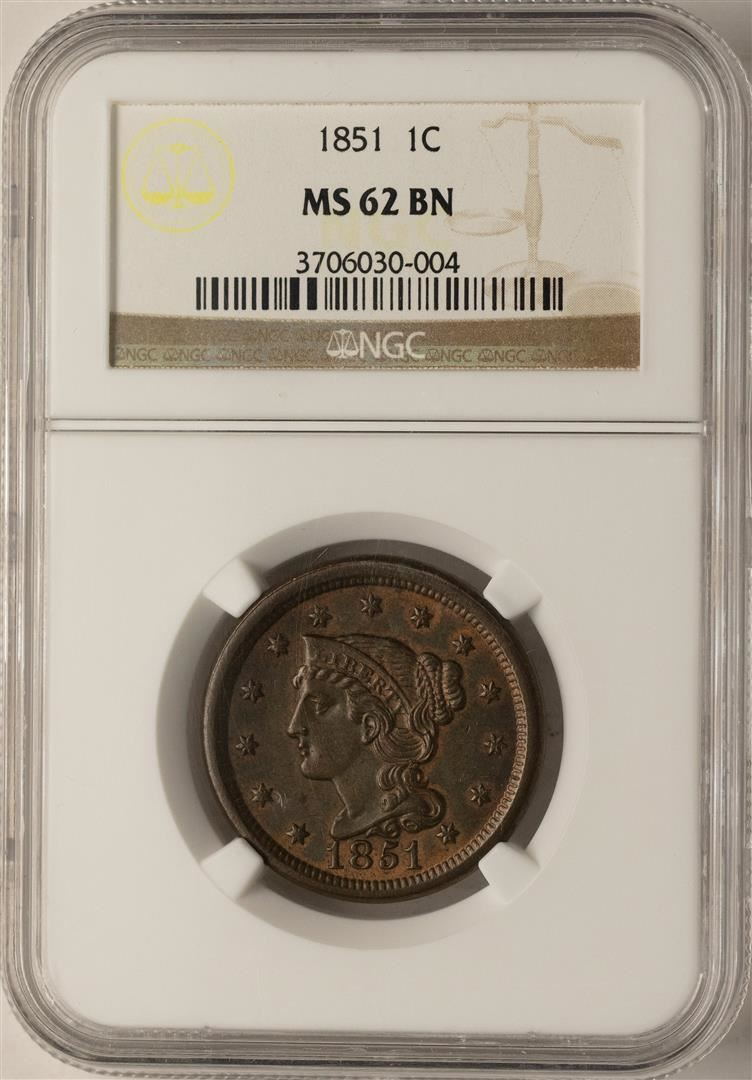 One 1851 Braided Hair Large Cent Coin NGC MS62BN. NGC Certified.