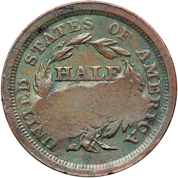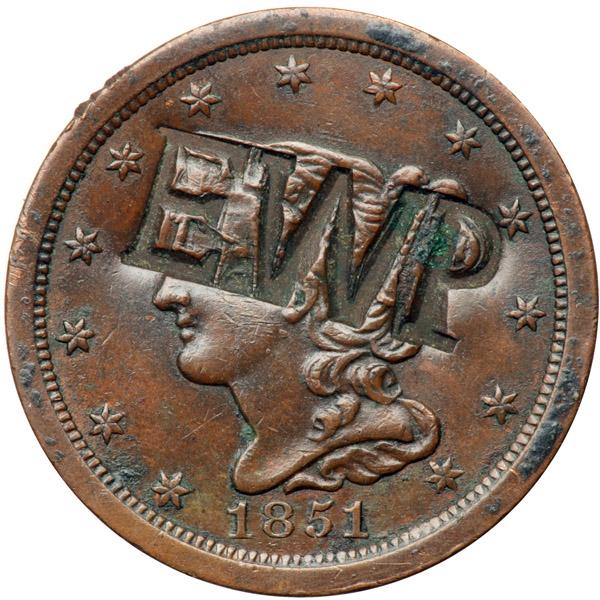 1851 C-1 R1 Counterstamped EF40. Glossy chocolate brown with greenish olive toning in protected areas on the reverse. There are a few tiny rim nicks and traces of crud in some of the protected areas. EDS. The repunching right of the base of the second 1 is sharp. Strongly counterstamped "E.WP" in large block letters across the head. This stamp is not mentioned in Brunk. Davy #51.1.7.