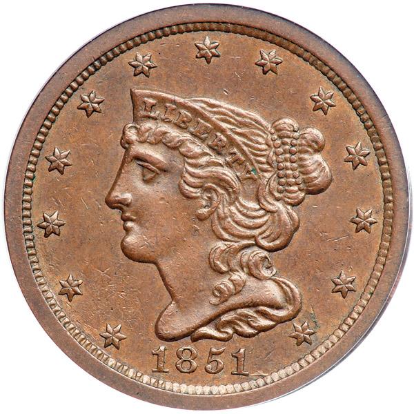 1851 C-1 R1. PCGS graded AU-58 Plus. Frosty medium brown and light chocolate. The only mark is a small spot of darker toning on the rim over the first T in STATES. Nicely struck EDS with full radial lines in all the stars. Just a hint of friction from mint state. Our grade is consistent with the slab grade. The attribution is noted on the PCGS label.