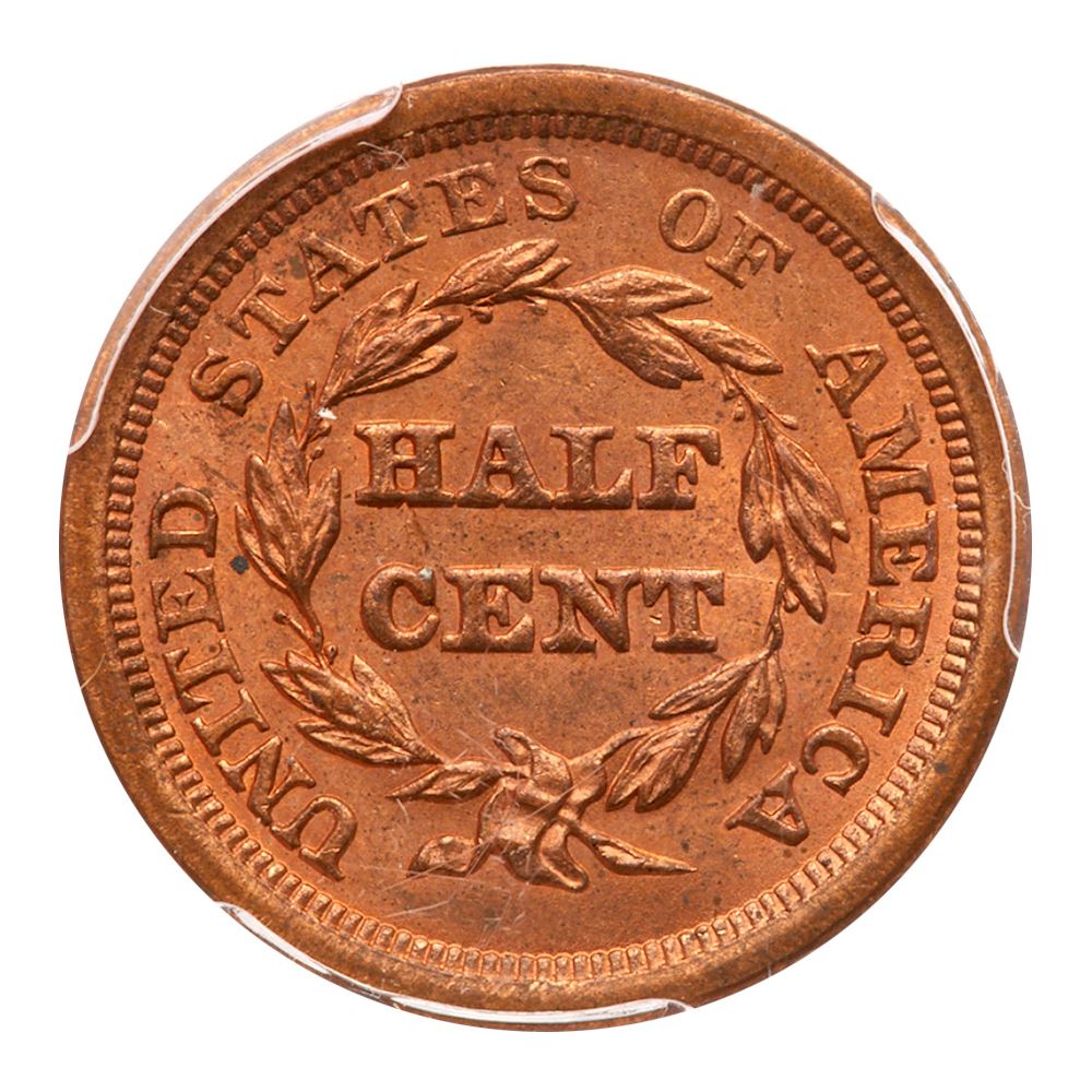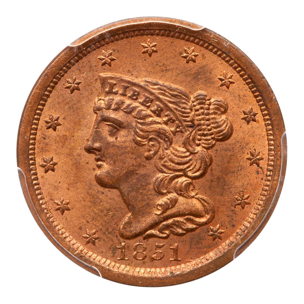 1851 C-1 R1 PCGS graded MS64 Red. Lustrous bright mint red just starting to mellow on the highpoints. There are some microscopic specks of toning on both sides, none notable. The best identifying mark is a small struck-through line just right of the mouth as struck. MDS. The repunching right of the second 1 is clear. Our grade is MS63+, very close to MS64. An impressive half cent. Estimated Value 1,250 - UP