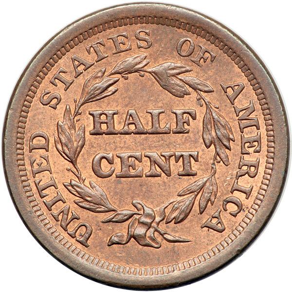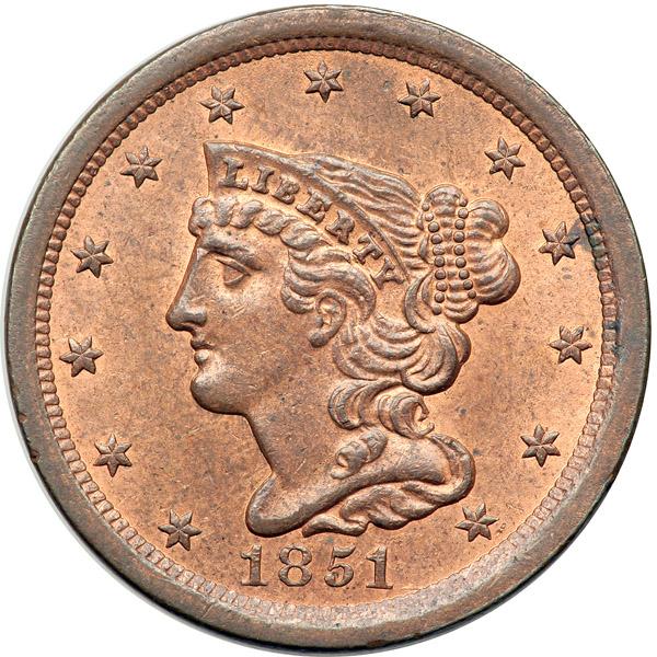 1851 C-1 R1 Second 1 Repunched MS63. Mint red fading to light steel brown on the highpoints, at least half the red remaining on both sides. The only mark visible without the aid of a strong glass is a small spot of darker toning at the dentil tips right of star 10. MDS with clear doubling (from die bounce) on all of the stars with more subtle doubling on parts of the date and profile. The repunching well right of the second 1 is clear. A choice example that offers excellent eye appeal. Removed from a PCGS slab graded MS63RB (PCGS label included, #1225.63/21623157).