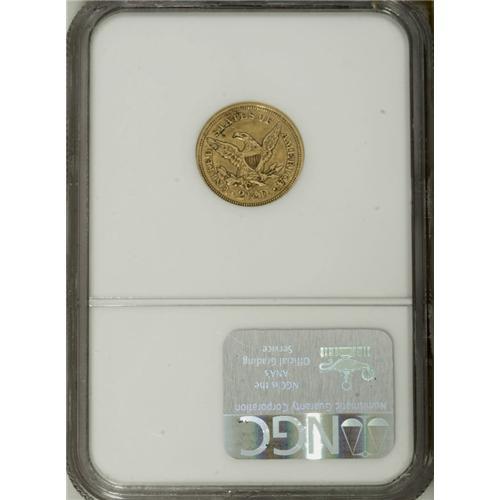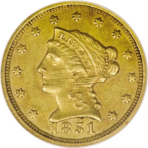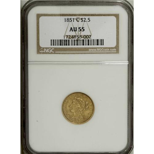 <B>1851-C $2 1/2 AU55 NGC.</B></I> Variety 13-G. A rare coin above Extremely Fine; Mint State coins are seldom encountered. Heavy horizontal lines cross through the center of the obverse on this piece, an injury to the die that is seen on many coins of this issue, but it lacks the canal-shaped grooves before and behind Liberty's head. Otherwise the brownish-gold surfaces are appealing, with few noticeable abrasions and some luster still evident. Census: 12 in 55, 30 finer (1/07).<BR><BR><b>Shipping:</b> Coins & Currency (<a target="_blank" href="http://www.heritageauctions.com/common/shipping.php">view shipping information</a>)