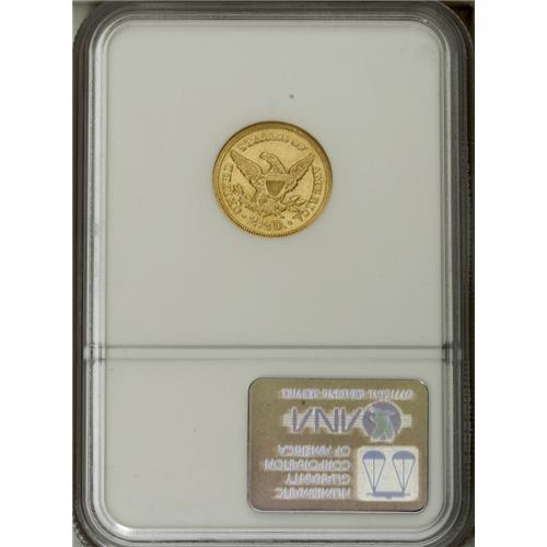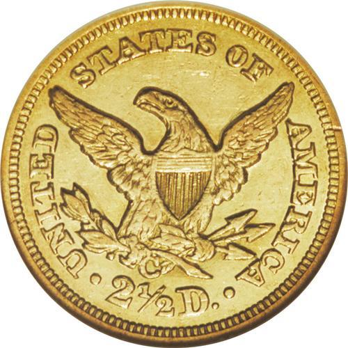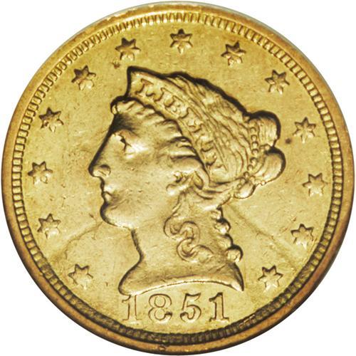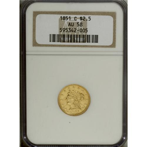 <B>1851-C $2 1/2 AU58 NGC.</B></I> Variety 13-G. The Charlotte Mint specialist can often identify the 1851-C quarter eagle by the obverse alone. This is because the issue usually comes with a couple of prominent strike-throughs on the lower obverse field. These are present on this unmarked and nicely struck example, but have no effect on the technical grade, and are seen more often than not on the '51-C. Mint workers were negligent in cleaning the die during the issue's production. Only 14,923 pieces were struck. Census: 17 in 58, 12 finer (11/06).<BR><BR><b>Shipping:</b> Coin/Currency (<a target="_blank" href="http://www.heritageauctions.com/common/shipping.php">view shipping information</a>)