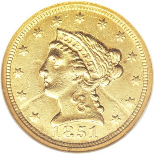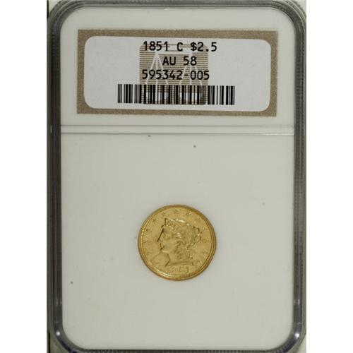 <B>1851-C $2 1/2 AU58 NGC.</B></I> Variety 13-G. The Charlotte Mint specialist can often identify the 1851-C quarter eagle by the obverse alone. This is because the issue usually comes with a couple of prominent strike-throughs on the lower obverse field. They are present on this unmarked and nicely struck example, but have no effect on the technical grade, and are seen more often than not on the '51-C. Mint workers were negligent in cleaning the die during the issue's production. Bright yellow-gold surfaces with the usual softness in the centers. Only 14,923 pieces were struck. Census: 17 in 58, 12 finer (11/06).<BR><BR><b>Shipping:</b> Coins & Currency (<a target="_blank" href="http://www.heritageauctions.com/common/shipping.php">view shipping information</a>)