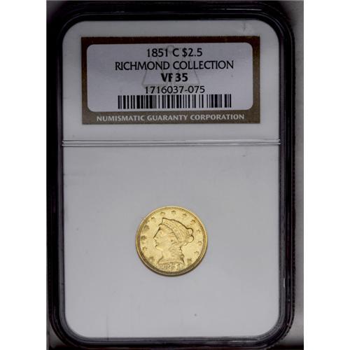 <B>1851-C<$2 1/2> VF35 NGC.</B></I> Variety 13-G. Light khaki-gold toning embraces the borders, particularly the lower reverse. This piece retains glimpses of luster and probably has not received 25 points of wear, but the strike is typical on the eagle's neck and right (facing) wing. A diagonal roller mark (as made) crosses Liberty's cheek. <BR><I>Ex: Richmond Collection, Part One (David Lawrence, 7/04), lot 1136.</B></I>