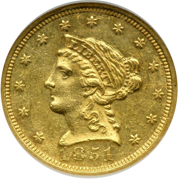 1851-C. NGC graded AU-58. Well struck with enough luster to justify this high grade. As usual, light to moderate marks in the unprotected areas. Only 14,923 struck. Pop 18; 16 finer (PCGS # 7760) .