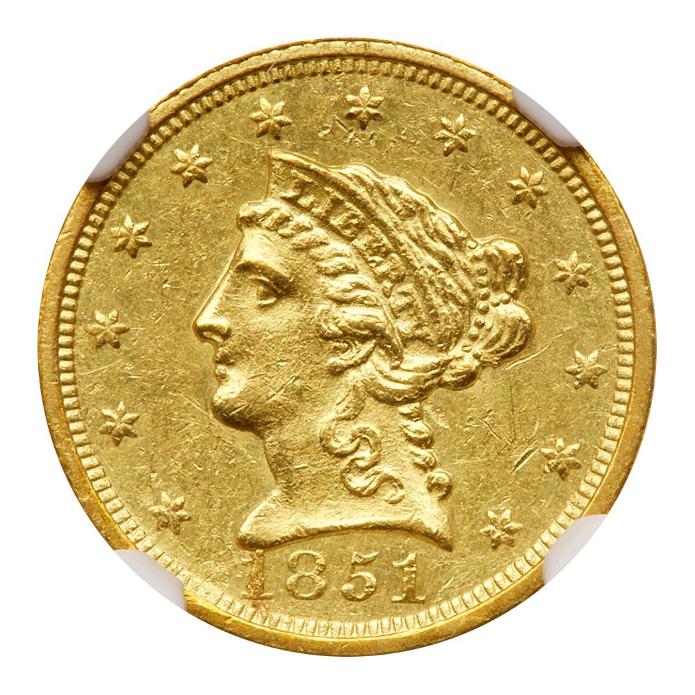 1851-C. NGC graded MS-61. This is a fairly well struck example of this low mintage date. Only 14,923 struck and from that issue about 125 are known today. The finest is a choice example graded by PCGS, and Mint State pieces are few in number, as most of the surviving coins show considerable circulation. The reverse is well defined on the eagle and legends, while the obverse has a bit of the often seen indistinct appearance. This particular coin is one of the best around and worthy of any top notch Charlotte gold collection. Pop 7; 7 finer at NGC. PCGS # 7760 Estimated Value 6,500 - 7,000