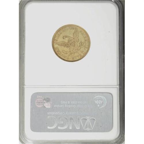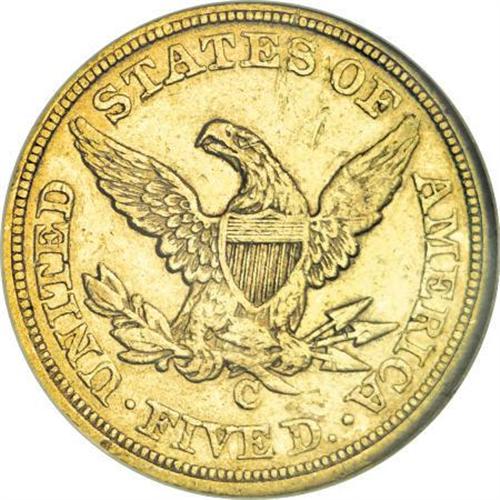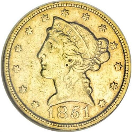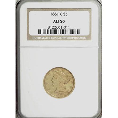 <B>1851-C $5 AU50 NGC.</B></I> Variety 16-G. The usual obverse with an "earring" or small center hole on Liberty's earlobe. An original and typically abraded yellow-gold Charlotte five that has the expected indistinctness of strike on the right wing, fletchings, and curls. Luster shimmers from protected areas.<BR><I>Ex: Greenwich Collection (Bowers and Merena, 1/91), lot 167.</B></I><BR><I>From The John Stimson, Sr. Collection, Part Two.</B></I><BR><BR><B>Coin Engraver:</B> Christian Gobrecht<BR><BR><b>Shipping:</b> Coins & Currency (<a target="_blank" href="http://www.heritageauctions.com/common/shipping.php">view shipping information</a>)