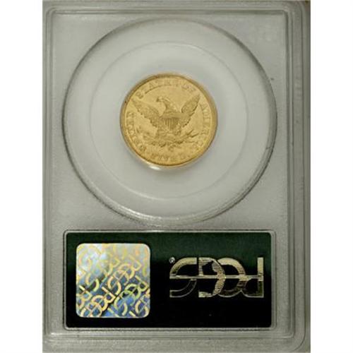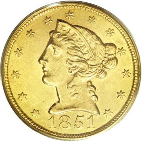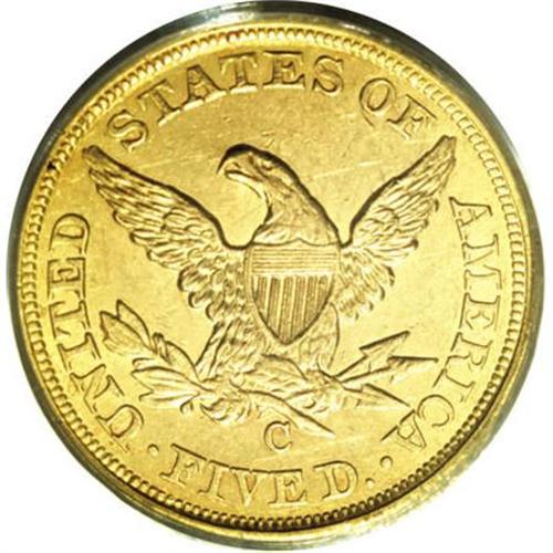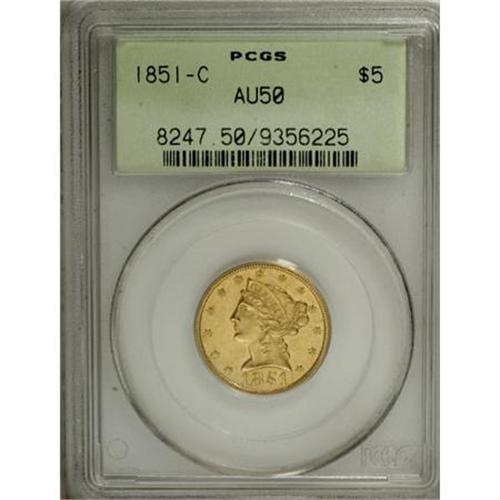 <B>1851-C $5 AU50 PCGS.</B></I> Variety 16-G. The 1851-C tends to come weakly struck but one would not know it from looking at this piece. It is remarkably sharp for the date and ranks as one of the better struck 1851-C half eagles seen. The surfaces are very clean with some minor ticks in the fields; on the reverse there is one thin, old scratch through the eagle's neck up to the left wing below the F in OF. The luster is nearly full with a semi-prooflike finish. One of the best features of this lovely coin is its excellent color with deep yellow-gold hues on both sides. This piece is totally original and it has never been dipped or processed. It is among the most attractive--and the crustiest--1851-C half eagles known, and it is a rare date with this degree of eye appeal. Housed in an old PCGS holder and conservatively graded by today's standards.<BR> The 1851-C is considerably rarer than any of the other Charlotte half eagles from the 1849-1853 era. It is especially difficult to locate in properly graded AU55 and better. There are only a half dozen or so known in Uncirculated with the finest being the PCGS MS64 that is Ex: Elrod collection.<BR><I>Ex: Chalkley Collection (Superior, 1/90), lot 4635. Accompanied by the original auction flip.</B></I><BR><I>From The Carolina Circle Collection.</B></I><BR><BR><B>Coin Engraver:</B> Christian Gobrecht<BR><BR><b>Shipping:</b> Coins & Currency (<a target="_blank" href="http://www.heritageauctions.com/common/shipping.php">view shipping information</a>)