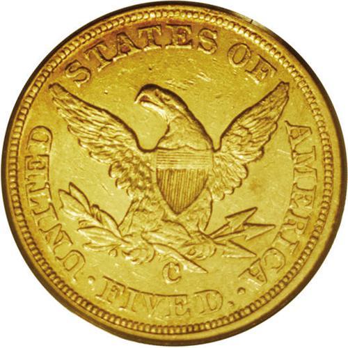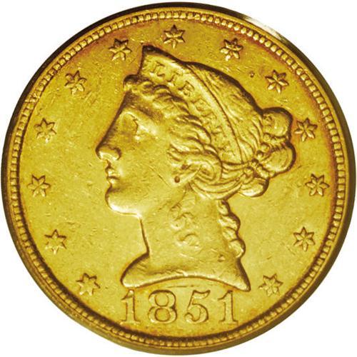<B>1851-C<$5> AU53 PCGS.</B></I> Variety 16-G. Nicely struck throughout with bright yellow-gold surfaces that, while moderately abraded, generate a substantial amount of appeal from subtle reflective qualities. Despite multiple appearances in this sale, the 1851-C half eagle is a scarcer issue than one might imagine from its comparatively high C-mint mintage of 49,176 pieces. Population: 11 in 53, 15 finer (4/06).