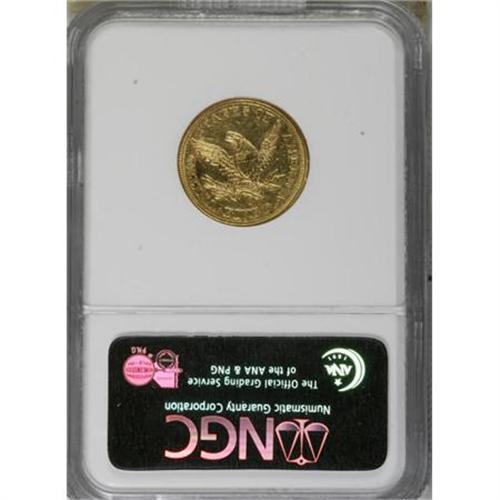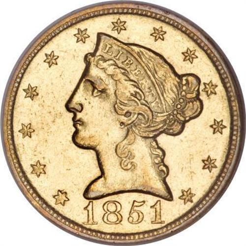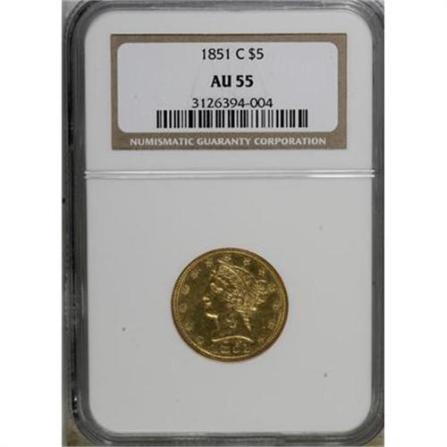 <B>1851-C $5 AU55 NGC.</B></I> Variety 16-G, attributed by an "earring" or small center hole on Liberty's earlobe. The bright yellow-green surfaces of this Choice AU example exhibit luster in the protected areas. An attentive strike leaves strong definition on the design elements, save for the usual softness on the eagle's neck feathers. A few minuscule marks do not disturb.<BR><BR><B>Coin Engraver:</B> Christian Gobrecht<BR><BR><b>Shipping:</b> Coins & Currency (<a target="_blank" href="http://www.heritageauctions.com/common/shipping.php">view shipping information</a>)