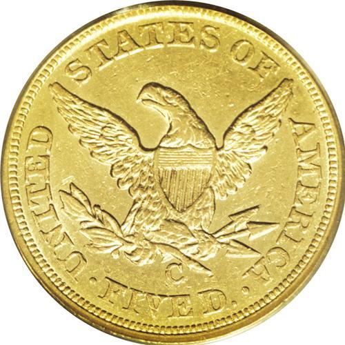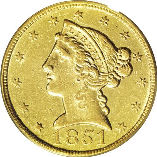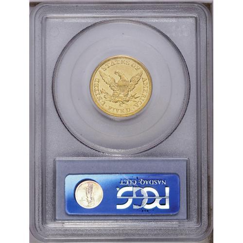 <B>1851-C<$5> AU55 PCGS.</B></I> Variety 16-G. Easily distinguished by a small mint-made punchmark on Liberty's earlobe. Unlike the similarly dated gold dollar, the 1851-C half eagle is one of the rarer coins of this denomination produced at the North Carolina branch mint. This issue (49,176 pieces produced) is equally as elusive as the 1854-C (39,283 pieces produced) in high grades, but the edge goes to the latter issue in terms of overall rarity. Winter estimates that between 23 and 25 1851-C half eagles are extant in About Uncirculated and Mint State grades. With subtle, green-gold color, the present example exhibits a refreshingly original appearance. Like most surviving representatives, the surfaces are peppered with small and moderate abrasions. The strike is, however, remarkably bold for this otherwise poorly produced issue.