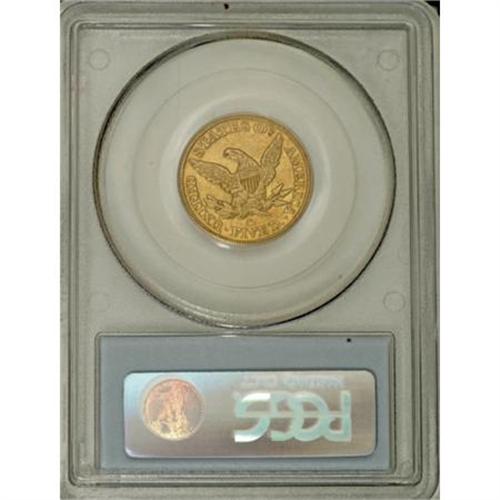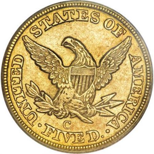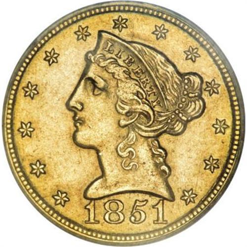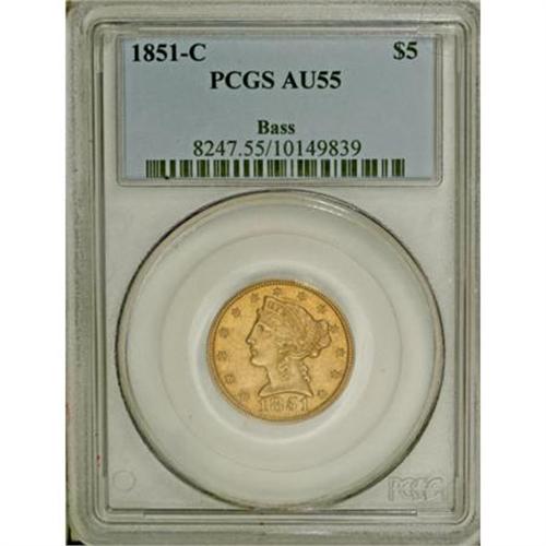 <B>1851-C $5 AU55 PCGS.</B></I> Variety 17-G, but see our discussion below. This is the rare Normal Obverse variety, without the hollow punchmark that is often called an "earring." The punchmark is actually a hollow center dot used for die engraving. Doug Winter notes that he has only seen four or five examples of the Normal Obverse variety.<BR> The obverse has a relatively large date, high in the exergue, with the first 1 solidly joined to the bust, and the second 1 all but touching the bust. A tiny projection extends left from the base of the first 1, a tiny remnant of repunching. The earlobe is normal. The reverse is called Reverse G by Winter, but this is incorrect. The mintmark is centered over the left side of the V, with its left edge over the space between IV and its right edge over the right serif of the V. For Reverse G, Winter requires that the right edge of the mintmark is over the center of E. <BR> Further examination shows that the reverse is actually Reverse F, from 1849. It is State II of the reverse, with a prominent die crack from the border to the left serif of U, and on to the lowest leaf and eagle's leg. Although the surfaces of this pleasing green-gold example have a few light hairlines, it is nicely detailed, and both sides are accented by warm orange toning. Some weakness at the center of the reverse is typical of nearly all Dahlonega half eagles.<BR><I>Ex: 1968 ANA (Abe Kosoff, 8/1968), lot 967; Harry W. Bass, Jr. (Bowers and Merena, 10/1999), lot 1023.</B></I><BR><BR><B>Coin Engraver:</B> Christian Gobrecht<BR><BR><b>Shipping:</b> Coins & Currency (<a target="_blank" href="http://www.heritageauctions.com/common/shipping.php">view shipping information</a>)