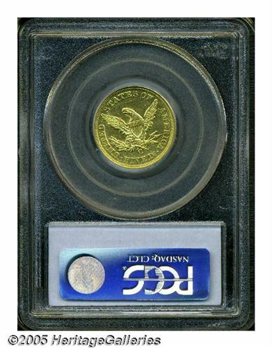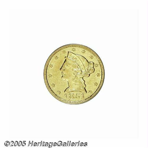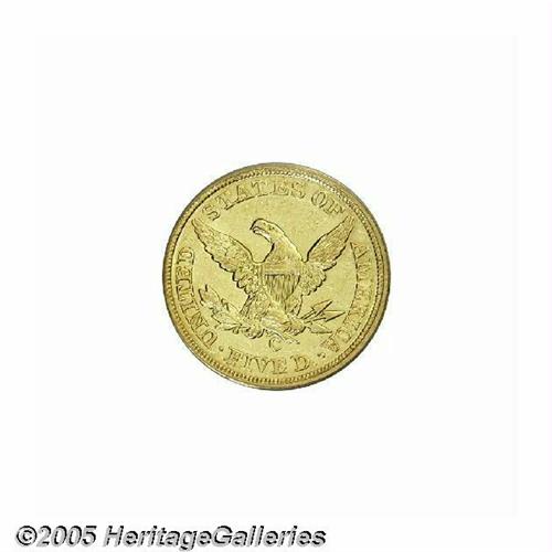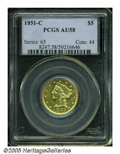 <B>1851-C<$5> AU58 PCGS.</B></I> Variety 16-G. The curious small circular hole on Liberty's earlobe is of mint origin and is diagnostic for the issue. A bright canary-gold Charlotte Half Eagle, luster is extensive although a hint of wear is noted on the highpoints of the portrait. The strike is certainly above average, if not needle-sharp on the curl beneath the ear and selected other portions of the design. Minor marks are distributed, these only affect the final star, far from the focal points. Population: 4 in 58, 4 finer (6/05).