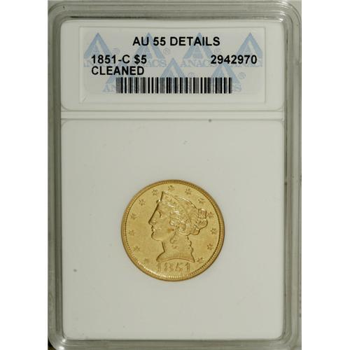 <B>1851-C $5 --Cleaned--ANACS. AU55 Details.</B></I> Variety 16-G. A sharply struck and unworn but granular and lackluster example of this popular Charlotte issue. A slender vertical mark crosses a point of star 2, but no other abrasions are remotely worthy of mention.<BR><BR><b>Shipping:</b> Coins & Currency (<a target="_blank" href="http://www.heritageauctions.com/common/shipping.php">view shipping information</a>)