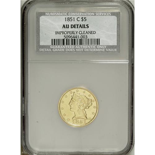 <B>1851-C $5 --Improperly Cleaned--NCS. AU Details.</B></I> Variety 16-G. A bold striking with relatively few and unobtrusive surface marks. As for the cleaning qualifier, the surfaces do not reveal any hairlines and just appear to be a smidgen bright. The collector seeking a reasonably priced C-mint half eagle with strong definition should really have a look.<BR><BR><b>Shipping:</b> Coin/Currency (<a target="_blank" href="http://www.heritageauctions.com/common/shipping.php">view shipping information</a>)