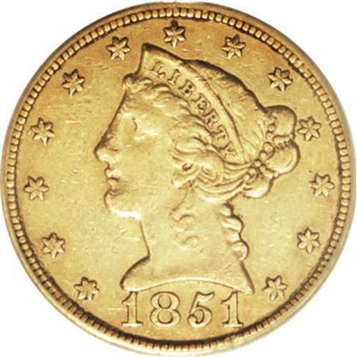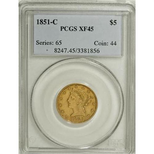 <B>1851-C $5 XF45 PCGS.</B></I> This is the extremely rare die marriage listed as Variety 17-G in the Winter standard reference. The "G" designation is inaccurate, since the reverse differs from the usual 16-G variety. The mintmark is much lower in the field and rests above the V instead of the E. It is the F reverse from 1849, with a radial die crack near the U in UNITED. The obverse die shows the second 1 in the date slightly higher, virtually touching the bust. There is <B>no</B></I> punchmark on the lobe of Liberty's ear, unlike 16-G. The base of the first 1 in the date is repunched northwest. A search of Heritage Permanent Auction Archives, which images dozens of '51-C fives, failed to locate another example from these dies.<BR>The present piece retains its "original skin." Golden-tan patination bathes the borders. The borders are sharply struck, while Liberty's curls and the fletchings show some incompleteness of strike. An important opportunity for the specialist.<BR><BR><B>Coin Engraver:</B> Christian Gobrecht<BR><BR><b>Shipping:</b> Coins & Currency (<a target="_blank" href="http://www.heritageauctions.com/common/shipping.php">view shipping information</a>)