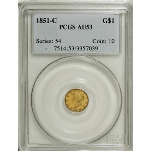 <B>1851-C G$1 AU53 PCGS.</B></I> Variety 5-E. This well struck Charlotte gold dollar has the sharpness of an AU58 example, but marks are noted near the coronet tip, cheekbone, and ear. The reverse is abraded near the ST in STATES and the CA in AMERICA.<BR><BR><B>Coin Engraver:</B> James B. Longacre<BR><BR><b>Shipping:</b> Coins & Currency (<a target="_blank" href="http://www.heritageauctions.com/common/shipping.php">view shipping information</a>)