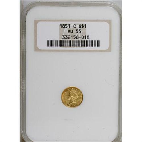 <B>1851-C G$1 AU55 NGC.</B></I> Variety 5-E. Intricately struck for a Charlotte Mint issue, and the fields show few marks. Glimpses of cherry-wine luster accompany protected regions. Encased in a former generation holder.<BR><BR><B>Coin Engraver:</B> James B. Longacre<BR><BR><b>Shipping:</b> Coins & Currency (<a target="_blank" href="http://www.heritageauctions.com/common/shipping.php">view shipping information</a>)