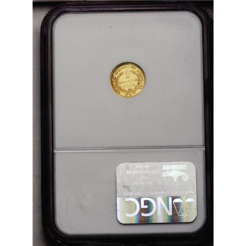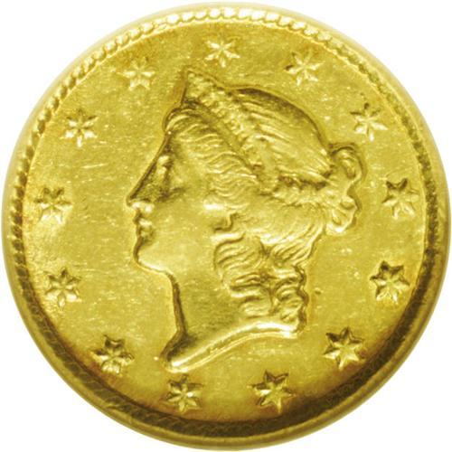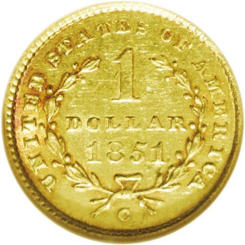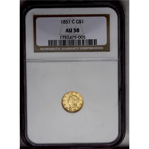 <B>1851-C<G$1> AU58 NGC.</B></I> Variety 4-D. This variety and Winter 5-E are two plentiful varieties, while variety 6-F is quite rare. In fact, Variety 4-D is the most common of all 1851-C gold dollar varieties, although it seems a little weird calling a Charlotte Mint gold coin "common." This example has satiny luster with bright green-gold color and a splash of orange toning on the reverse. The surfaces are lightly abraded, but not excessively so.