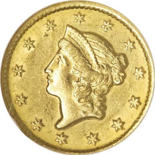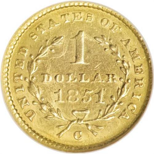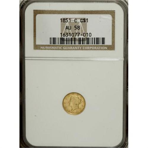 <B>1851-C G$1 AU58 NGC.</B></I> Variety 4-D. A lovely yellow-gold Charlotte near-Mint example. Bright luster dominates the borders and fills recesses of the portrait. The hair near the ear has a whisper of friction, but marks are virtually absent, and the eye appeal is imposing. Just 41,267 pieces were struck.<BR><BR><B>Coin Engraver:</B> James B. Longacre<BR><BR><b>Shipping:</b> Coins & Currency (<a target="_blank" href="http://www.heritageauctions.com/common/shipping.php">view shipping information</a>)