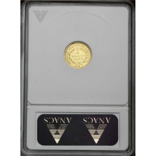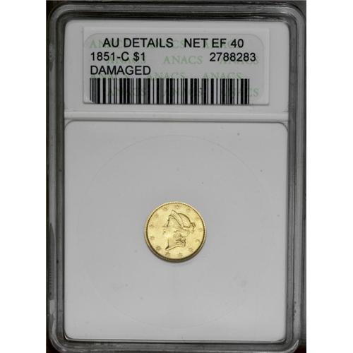 <B>1851-C<G$1>--Damaged--ANACS. AU Details. Net XF40.</B></I> Variety 5-E. A small dig to the right of the prominent 1 slightly bends this Charlotte gold dollar. A few minor rim nicks are noted. Nonetheless, this sharp example has ample bright luster, and should please many value-conscious collectors.