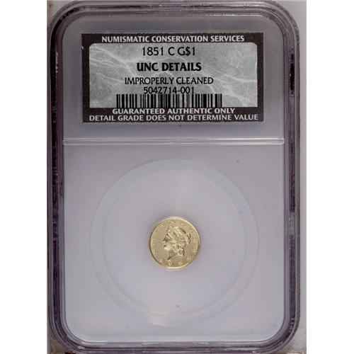 <B>1851-C G$1 --Improperly Cleaned--NCS. Unc. Details.</B></I> Variety 4-D. A bold but moderately hairlined and glossy example of this collectible Charlotte Gold Dollar issue. A light die crack crosses the first A in AMERICA, and Liberty's profile is clashed through the D in DOLLAR.