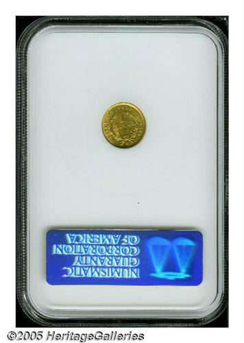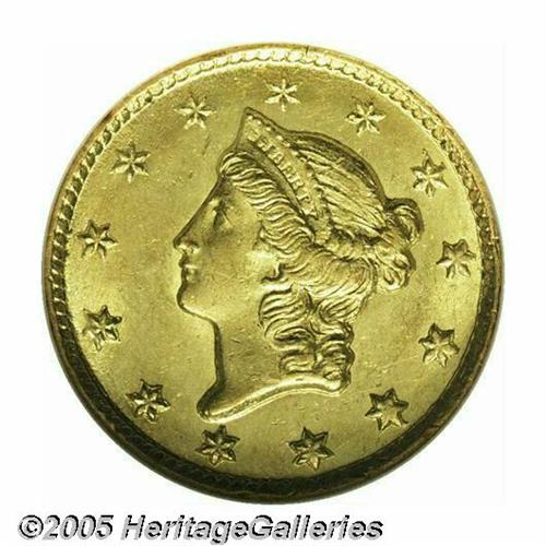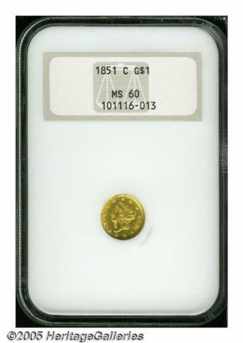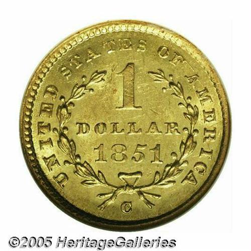 <B>1851-C<G$1> MS60 NGC.</B></I> Variety 4-D. The 1851-C is the most frequently encountered of all Type One Charlotte issues, representing 51.06 of the total mintage. It is also a relatively available coin in mint condition with some 65-75 pieces believed known in MS60 and better grades. This is a well, but not quite fully struck example that has attractive green-gold surfaces that are peppered with numerous small abrasions, none of which are important enough to deserve individual mention.<BR><I>From the Dr. Kurt Peters Collection.</B></I> From the Dr. Kurt Peters Collection.