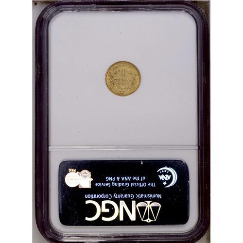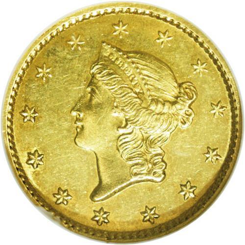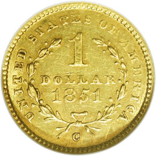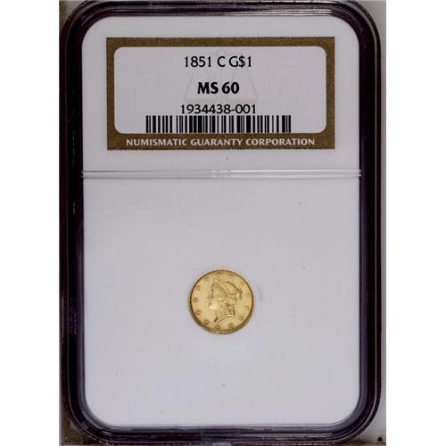 <B>1851-C<G$1> MS60 NGC.</B></I> Variety 6-F. While other diagnostics are not so clear on this piece, the most readily identifiable attribution marker is the die crack from the rim to the second S in STATES. Only moderately scarce in Uncirculated grades, the Condition Census for the 1851-C is composed of solid Gem coins. This piece has the usual green-gold color with a slight overlay of reddish patina. Sharply struck with a couple of marks over the LL in DOLLAR on the reverse. <BR><BR><B>Important notice:</B> Heritage usually auctions material at the rate of 200-250 lots per hour. On some occasions eBay Live bid software or the Internet may not be able to keep up with the pace of the auction. We recommend placing a realistic absentee bid now as insurance to avoid disappointment. Occasionally the auctioneer may eliminate or reject an eBay Live bid, and the auctioneer may also reopen a lot after the close of the eBay live bidding (usually because we missed an audience bid), and may reject your bid even if it shows you as the winning bidder. By bidding via eBay Live, you agree that Heritage may award the lot to another bidder at its sole discretion under the circumstances described above or any other reasonable circumstances. Since eBay bids are not shown to us until we open the lot on the floor, we treat those bids just like floor bids. In most cases the floor responds before the eBay bid is presented to us, due to Internet lag time, so for consistency we have made it a policy that floor bids are always considered first over tie eBay live bids. Also please note that all Heritage lots purchased through eBay Live carry a 20% Buyer's Premium. Please make sure you read the Terms and Conditions before you bid. This lot is being auctioned in conjunction with a live floor auction by Heritage Galleries & Auctioneers. All final auction and invoice information will be supplied by Heritage Galleries & Auctioneers, and all other information should be considered preliminary. Lot:2258 <BR><BR><B>Winning Notification and Billing:</B> After the FINAL session in this auction is complete, Heritage will send e-mail and snail mail invoices. This process normally takes several days. All final auction and invoice information will be supplied by Heritage Galleries & Auctioneers, and all other information should be considered preliminary. <BR><BR>This auction will be conducted on a live auction floor and over the Internet through eBay Live. If you choose to place an absentee bid, please take a moment to <font color='#0000ff'><u><a href='http://pages.ebay.com/liveauctions/help/before/laabsentee.html'>learn how eBay Live absentee bidding works</a></u></font><font color='#000000'>