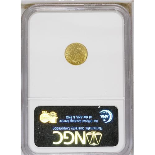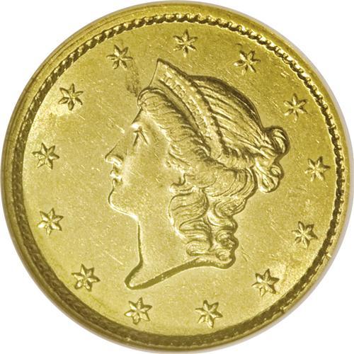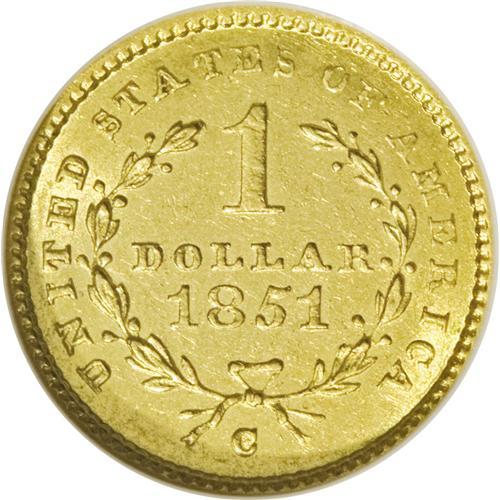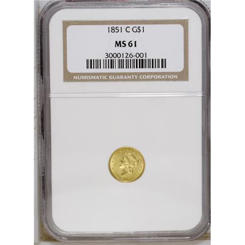 <B>1851-C G$1 MS61 NGC.</B></I> Variety 6-F. This variety is immediately identifiable by the die crack from the rim to the left side of the second S in STATES. The 1851-C is a common issue by Charlotte standards and is relatively available even in Uncirculated grades. This is a bright yellow-gold example that is well struck on both obverse and reverse. Numerous tiny abrasions are scattered over each side and account for the MS61 grade.<BR><BR><b>Shipping:</b> Coin/Currency (<a target="_blank" href="http://www.heritageauctions.com/common/shipping.php">view shipping information</a>)