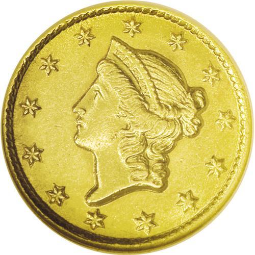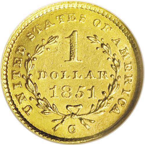 <B>1851-C<G$1> MS62 NGC.</B></I> Variety 4-D. This is a great choice for the Charlotte Mint type collector, as it is the most common Type One gold dollar from the North Carolina Mint. This is a bright, lustrous Mint State example. All of the design elements are boldly struck, except for a couple of the lower obverse stars. Surface marks are definitely acceptable for the grade. An exceptional example with great eye appeal. Census: 37 in 62, 26 finer (8/06).