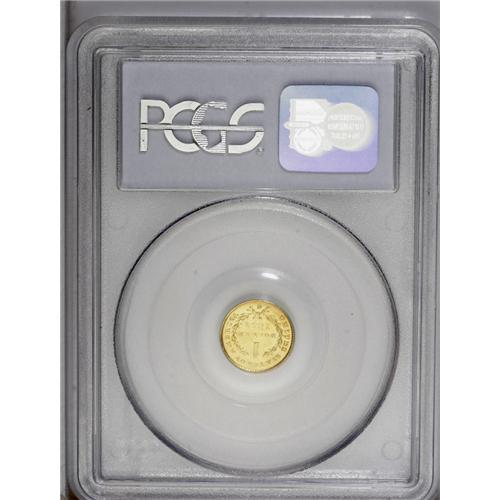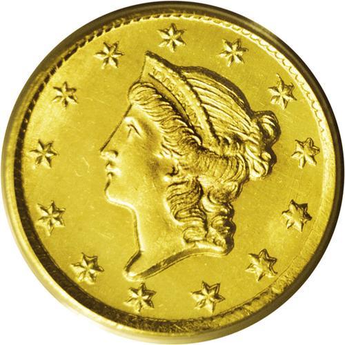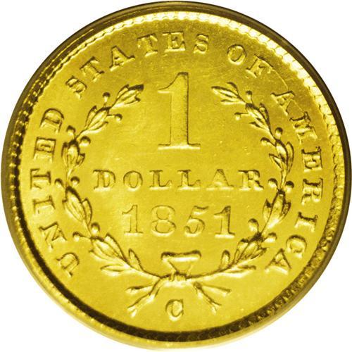 <B>1851-C<G$1> MS63 PCGS.</B></I> This is an impressive Mint State example with exceptional design details and a high degree of aesthetic appeal. Although the 1851-C gold dollar is one of the most common Charlotte mint gold dollars in high grades, examples are still important rarities in an absolute sense. Both sides of this specimen are sharply struck with the exception of the stars and obverse border from 3 o'clock to 4 o'clock. Diagonal and vertical die polish is visible in the reflective fields. The surfaces are fully brilliant with desirable green-gold color. Population: 13 in 63, 17 finer (7/06).<BR><I>From The Derrick Snider Collection.</B></I>