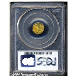 <B>1851-C<G$1> MS65 PCGS.</B></I> Variety 4-D. A late die state, there is a reverse die break atop OF AM in the legend UNITED STATES OF AMERICA. This issue's original mintage of 41,267 pieces is greater than that of all other Type One Gold Dollars from the Charlotte Mint <I>combined.</B></I> Not surprisingly, the 1851-C is the most plentiful Gold Dollar from this popular Southern branch mint. When viewed in the wider context of U.S. numismatics, however, the mintage of the 1851-C seems low. What's more, Winter's estimate of 65-75 pieces extant in Mint State is the sign of a conditionally scarce, if not rare issue. This is one of the better produced C-mint gold coins that we can remember handling. The obverse is typically sharper than the reverse, but even the latter side is bold throughout. Both sides are attractively toned with rich copper-orange shades dominating selected protected areas. There are a few small identifying marks: a thin scratch bisects the two stars at the base of the obverse, and a small patch of marks is seen above the LA of DOLLAR in the reverse field. A conditionally rare offering for the C-mint gold specialist. Population: 6 in 65, 2 finer (3/04). <BR><BR><B>Important notice:</B> Heritage usually auctions material at the rate of 200-250 lots per hour. On some occasions eBay Live bid software or the Internet may not be able to keep up with the pace of the auction. We recommend placing a realistic absentee bid now as insurance to avoid disappointment. Occasionally the auctioneer may eliminate or reject an eBay Live bid, and the auctioneer may also reopen a lot after the close of the eBay live bidding (usually because we missed an audience bid), and may reject your bid even if it shows you as the winning bidder. By bidding via eBay Live, you agree that Heritage may award the lot to another bidder at its sole discretion under the circumstances described above or any other reasonable circumstances. Since eBay bids are not shown to us until we open the lot on the floor, we treat those bids just like floor bids. In most cases the floor responds before the eBay bid is presented to us, due to Internet lag time, so for consistency we have made it a policy that floor bids are always considered first over tie eBay live bids. Also please note that all Heritage lots purchased through eBay Live carry a 20% Buyer's Premium. Please make sure you read the Terms and Conditions before you bid.