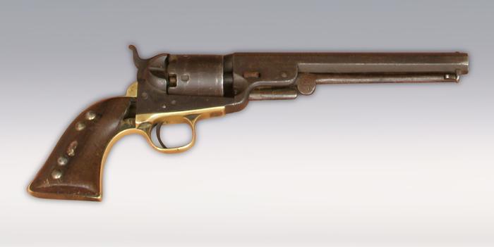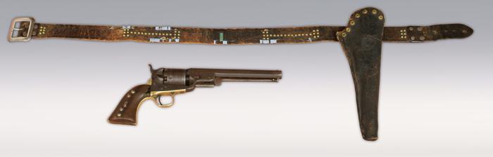 1851 Colt Navy Revolver With Original Belt and Holster. This outfit was collected from the Sioux Indians at Pine Ridge reservation and resided in the Custer Battlefield Museum in Montana for over 10 years. This type of revolver was one of many sidearms used by warriors in the Battle of the Little Big Horn. This revolver shows heavy Indian use including notches on the barrel and tacks on the grips. The holster and belt also show Indian decoration including remnants of beadwork and tack designs. All could have been a battlefield pick up. Condition Report: Gun has brown finish, action does not work properly. Grips show wood losses and tacks added. Military style holster shows alligatoring on leather and wear to back top. Tacks added at time of use. Belt has 4 1/2" of billet replaced. Numerous tacks added at time of use. Remnants of beads dating to the 1860s are still present.
