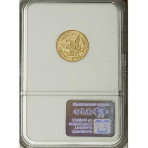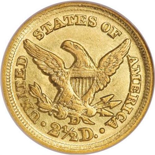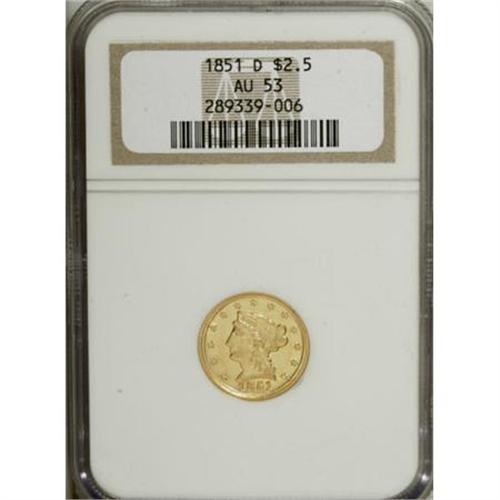 <B>1851-D $2 1/2 AU53 NGC.</B></I> Variety 14-M, the only variety identified. Nearly full frosty mint luster and brilliant yellow surfaces characterize this Dahlonega quarter eagle. Although the eagle's leg and claws are flat, other detail is quite sharp for a product of this Mint. Examples of the 1851-D are generally found in lower circulated grades through XF. Pieces that grade AU or finer are elusive. Census: 12 in 53, 27 finer (7/07).<BR><BR><B>Coin Engraver:</B> Christian Gobrecht<BR><BR><b>Shipping:</b> Coins & Currency (<a target="_blank" href="http://www.heritageauctions.com/common/shipping.php">view shipping information</a>\)