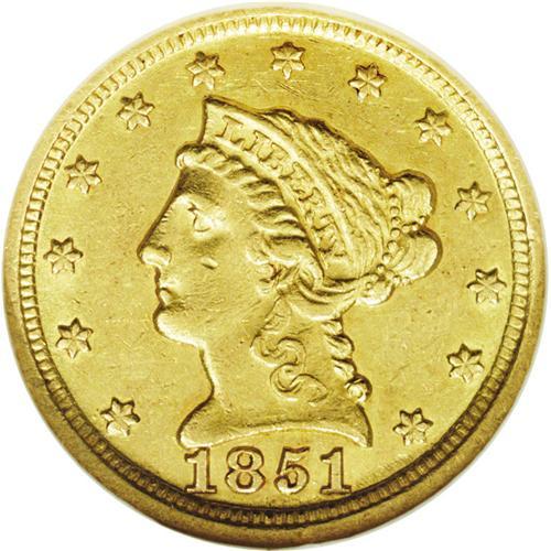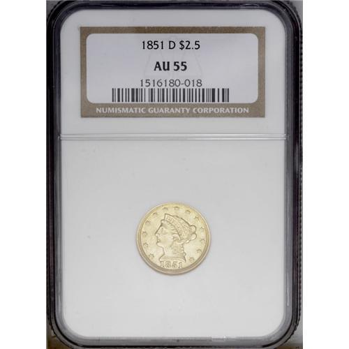 <B>1851-D<$2 1/2> AU55 NGC.</B></I> Variety 14-M. Substantial shimmering luster bathes the margins and devices. The strike is good aside from the right side denticles. Generally clean for the grade; a few wispy and subdued abrasions are noted near Liberty's jaw, and a thin scratch is concealed near the right border of the eagle's neck. Only 11,264 pieces were produced. Census: 12 in 55, 16 finer (2/06).