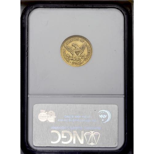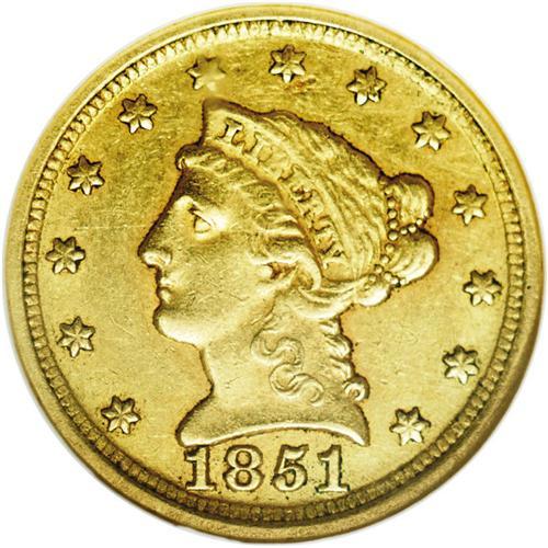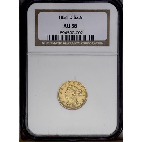 <B>1851-D<$2 1/2> AU58 NGC.</B></I> Variety 14-M. The only variety known of this year. The mintage of this issue was just 11,264 coins, and only about 100 to 110 examples remain today. The production preference for the Dahlonega Mint was half eagles, with more than 60,000 struck throughout the year. At the same time, the mintage of gold dollars was limited to less than 10,000 coins. Although typical of most, with weakness along the left leg of the eagle, this is a pleasing example with attractive green-gold coloration and only a few minor surface marks. <BR><BR><B>Important notice:</B> Heritage usually auctions material at the rate of 200-250 lots per hour. On some occasions eBay Live bid software or the Internet may not be able to keep up with the pace of the auction. We recommend placing a realistic absentee bid now as insurance to avoid disappointment. Occasionally the auctioneer may eliminate or reject an eBay Live bid, and the auctioneer may also reopen a lot after the close of the eBay live bidding (usually because we missed an audience bid), and may reject your bid even if it shows you as the winning bidder. By bidding via eBay Live, you agree that Heritage may award the lot to another bidder at its sole discretion under the circumstances described above or any other reasonable circumstances. Since eBay bids are not shown to us until we open the lot on the floor, we treat those bids just like floor bids. In most cases the floor responds before the eBay bid is presented to us, due to Internet lag time, so for consistency we have made it a policy that floor bids are always considered first over tie eBay live bids. Also please note that all Heritage lots purchased through eBay Live carry a 20% Buyer's Premium. Please make sure you read the Terms and Conditions before you bid. This lot is being auctioned in conjunction with a live floor auction by Heritage Galleries & Auctioneers. All final auction and invoice information will be supplied by Heritage Galleries & Auctioneers, and all other information should be considered preliminary. Lot:2382 <BR><BR><B>Winning Notification and Billing:</B> After the FINAL session in this auction is complete, Heritage will send e-mail and snail mail invoices. This process normally takes several days. All final auction and invoice information will be supplied by Heritage Galleries & Auctioneers, and all other information should be considered preliminary. <BR><BR>This auction will be conducted on a live auction floor and over the Internet through eBay Live. If you choose to place an absentee bid, please take a moment to <font color='#0000ff'><u><a href='http://pages.ebay.com/liveauctions/help/before/laabsentee.html'>learn how eBay Live absentee bidding works</a></u></font><font color='#000000'>